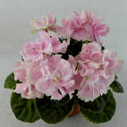 Огромные (6-7см) густо-махровые насыщенно-голубые цветы с зеленоватым кантом. Выставочный пестролистник. Зелёные листья с лиловой каймой. Шикарный букет на крепких цветоносах. Суперобильное цветение.