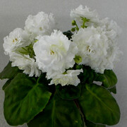 Очень крупные махровые белые цветы-розы с густой зелёной бахромой. Очень красивые! Выставочная розетка цвета весенней зелени, волнистые листья с округлыми зубчиками.